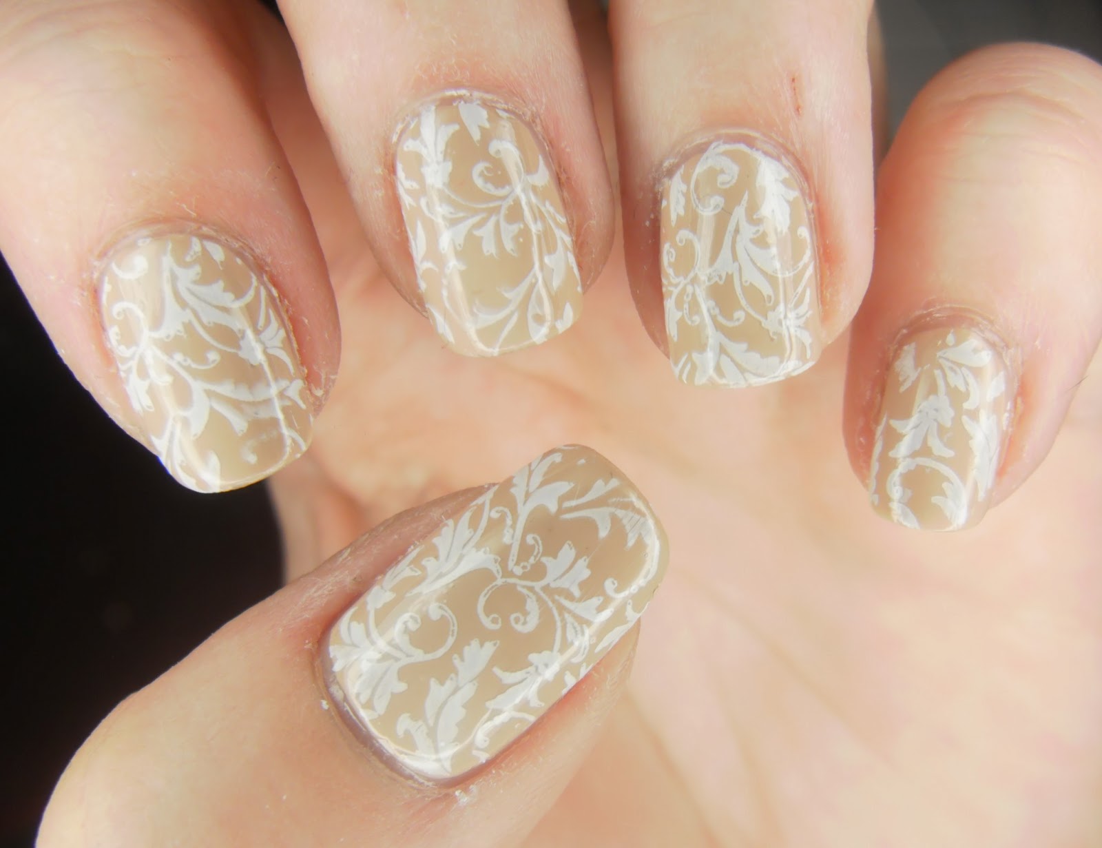 My base is 2true shade 11, from Superdrug. This is a really nice nude - my new closest-to-mannequin-hands polish. I stamped with my favourite image from DRK-B, and Konad White. It hasn't stamped quite as crisply as it could have, but I think that adds to the look. It's kind of vintagey and pretty, and I think very work appropriate. This is also after work (hence the even worse than usual cuticles!) and look, no chips! Rare for me, especially from a budget brand!