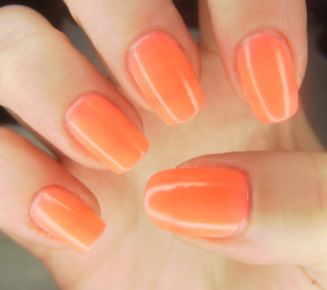 Shell-O is a neon orange that leans a little towards coral, and was the hardest to photograph. Even with a bit of tweaking, this isn't really too colour accurate. This is 3 coats.