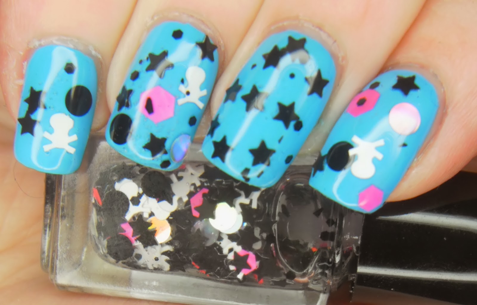 Death Star. Such a bottle of awesomeness! Full of fabulous things, like skulls, stars, circles, and big hexes. Minimal fishing too - this is 2 coats (over SH Model Behavior), and the glitters were jumping onto the brush! A perfect glitter topper.